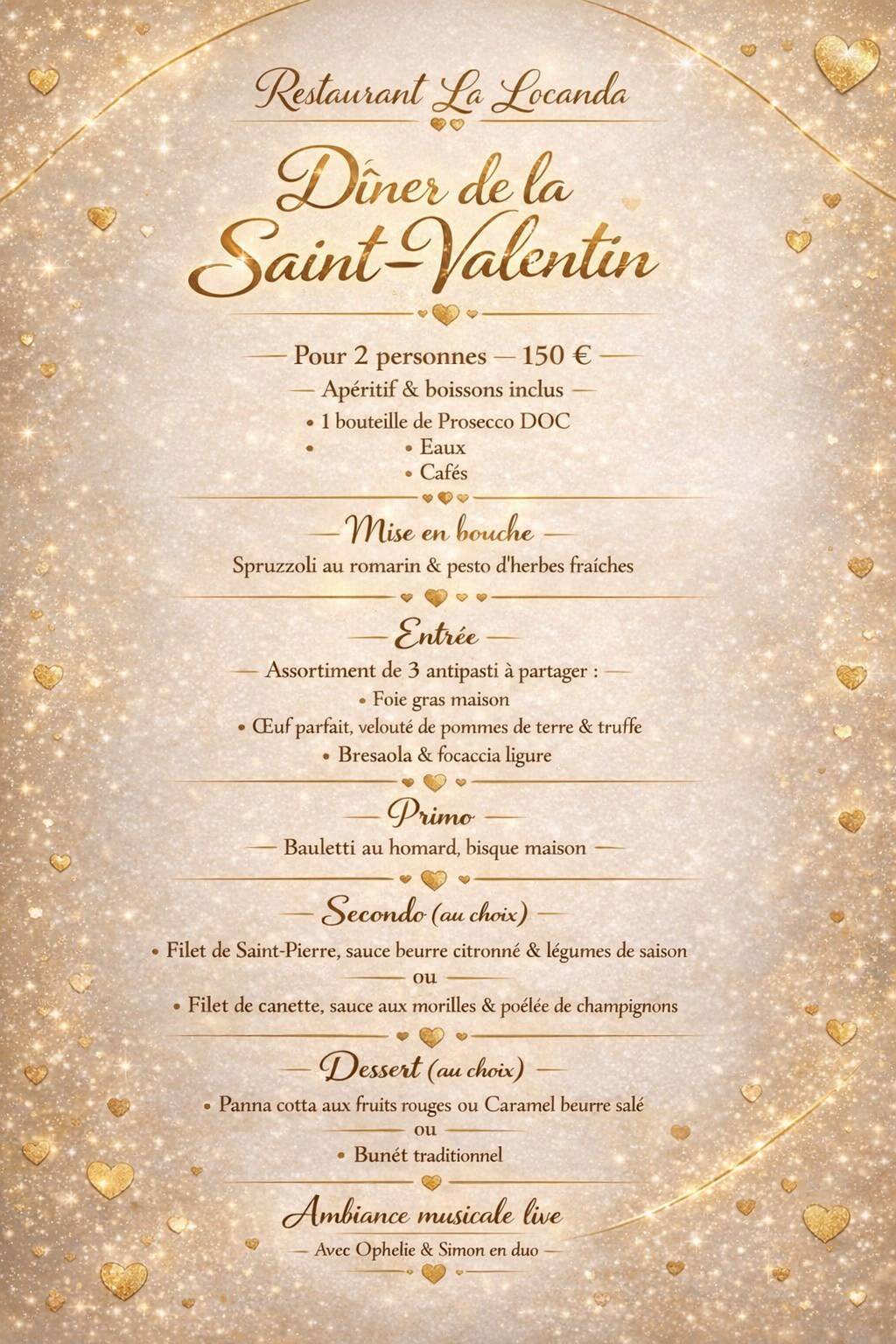Dans une ambiance chaleureuse et élégante, partagez un moment privilégié autour d’une cuisine généreuse, idéale pour faire de cette soirée de Saint-Valentin un souvenir inoubliable, placé sous le signe du plaisir et de la convivialité.