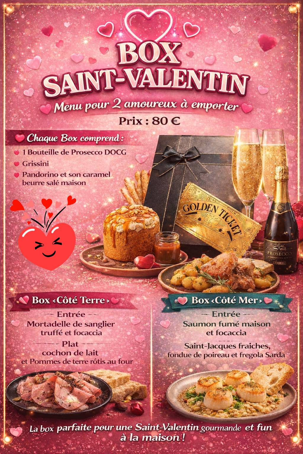 Pour ceux qui préfèrent célébrer chez eux, nous avons également conçu deux box Saint-Valentin à emporter, idéales pour profiter de la cuisine de La Locanda dans l’intimité de votre foyer, sans rien sacrifier au plaisir.